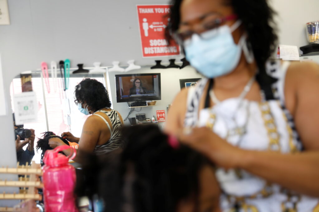 Miracle Williams braids the hair of a customer at Dimensions In Hair Salon in North Minneapolis on March 30, 2021.
