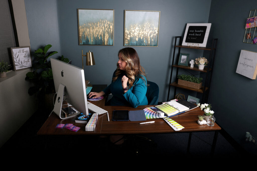 Web designer Lorie Smith, plaintiff in a Supreme Court case who objects to same-sex marriage, poses for a portrait at her office in Littleton, Colorado, Nov. 28, 2022.