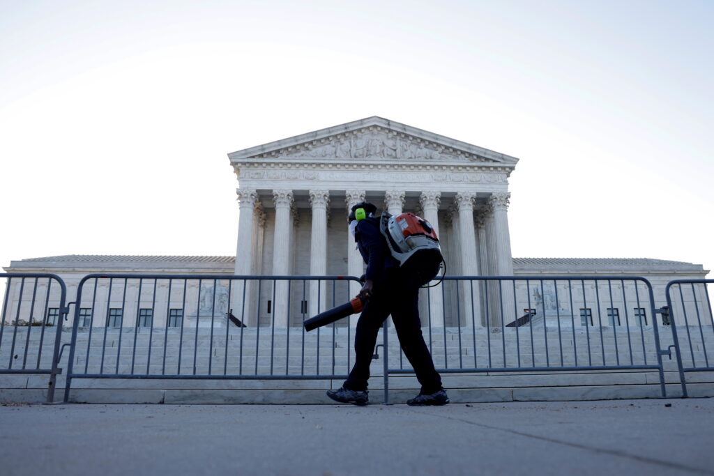 A worker clears front steps as morning rises over the U.S. Supreme Court building, still closed to the public due to Covid-19 pandemic, in Washington, D.C. April 26, 2021.