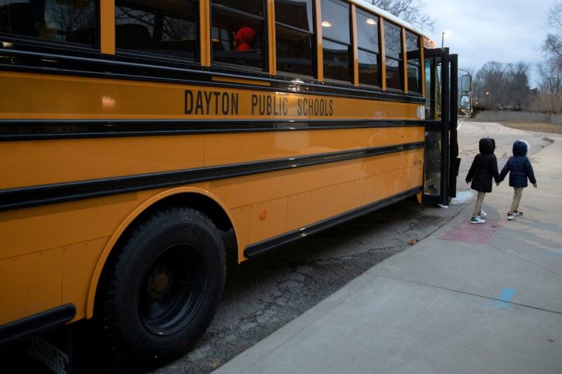 A bus drops students off as classes resume after teachers received the coronavirus disease vaccination, at Westwood Elementary School in Dayton, Ohio on March 1, 2021.