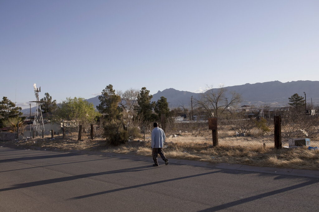 A man walks on a road through a neighborhood near the U.S.-Mexico border in Sunland Park, New Mexico, March 23, 2022.