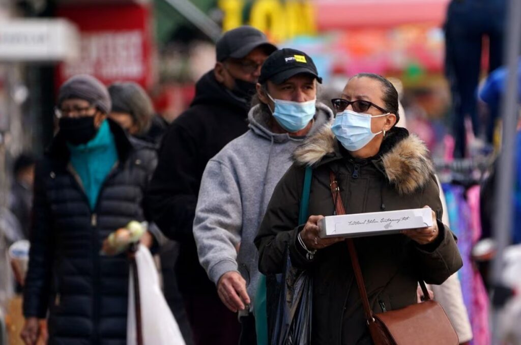People walk outside wearing masks during the coronavirus disease pandemic in the Harlem area of the Manhattan borough of New York City, New York, Feb. 10, 2022.
