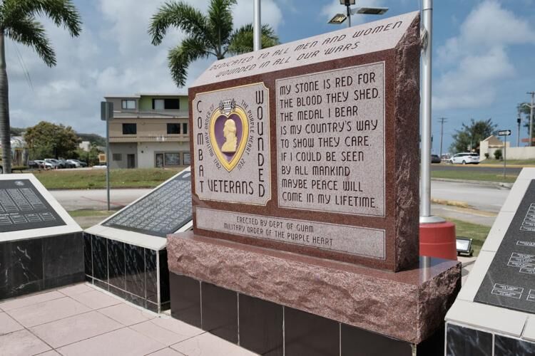 A memorial for combat wounded veterans is displayed at The Purple Heart and Gold Star Families Memorial Site at Skinner Plaza in Hagåtña on Thursday, Feb. 22, 2024.