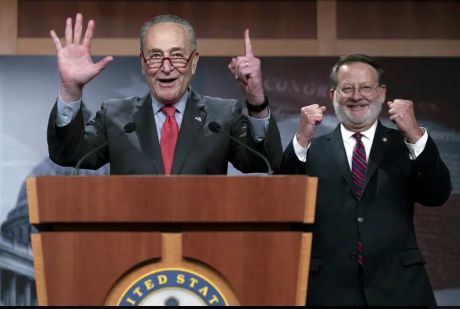 Senate Majority Leader Chuck Schumer, D-N.Y., joined by Sen. Gary Peters, D-Mich., chairman of the Democratic Senatorial Campaign Committee, signals "51" as he speaks with reporters after Democratic Sen. Raphael Warnock defeated Republican challenger Herschel Walker in a runoff election in Georgia last night, at the Capitol in Washington, Wednesday, Dec. 7, 2022.