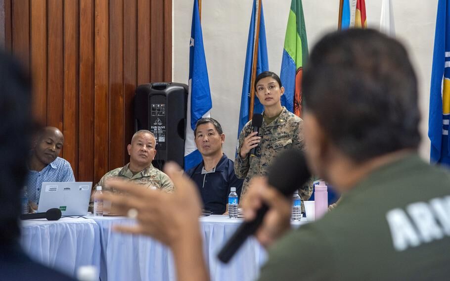 Maj. Asia Pastor, logistics plans officer for U.S. Marine Corps Forces Pacific, takes a question about a new U.S. military site from a Peleliu resident in Koror, Republic of Palau, May 15, 2024.