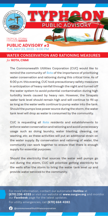 (Tuesday, May 23, 2023 – Rota, CNMI) – The Commonwealth Utilities Corporation would like to remind the community of Rota of the importance of prioritizing water conservation and rationing during this critical time. As of 6 p.m. this evening, CUC took precautionary safety measures in anticipation of heavy rainfall through the night and turned off the water system to avoid potential contamination during high turbidity levels caused by heavy rain. However, the Sinapalo water tank level should remain high and will continue to fill up as long as the water wells continue to pump water into the tank. Should the pumps lose power source during the storm, the water tank level will drop as water is consumed by the community.