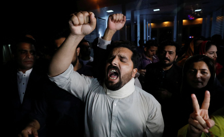 Supporters of former Pakistani Prime Minister Imran Khan chant slogans as they protest after he lost a confidence vote in the lower house of parliament, in Islamabad, Pakistan on April 10, 2022.