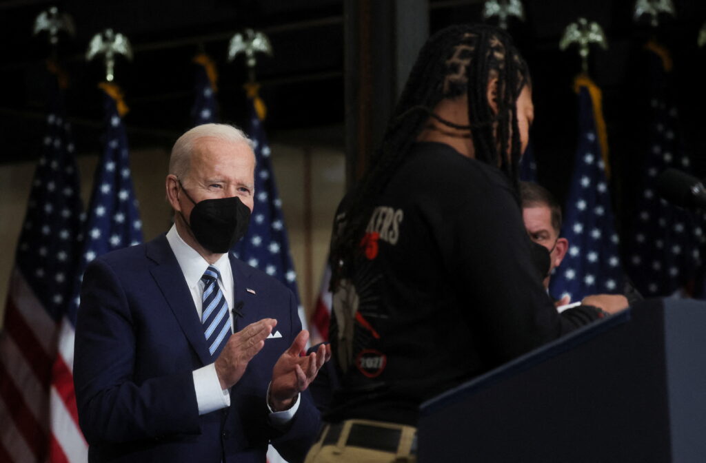 President Joe Biden applauds Cranita Jordan, a 4th year apprentice at Ironworkers Local 5, after she addressed the crowd gathered to see the president sign an executive order on federal construction project contracts and labor agreements during a visit to Ironworkers Local 5 in Upper Marlboro, Maryland, February 4, 2022.