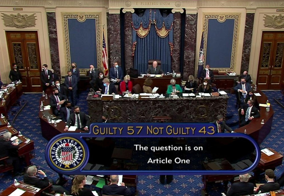 The U.S. Senate votes to acquit former President Donald Trump by a vote of 57 guilty to 43 not guilty, short of the 2/3s majority needed to convict, during the fifth day of the impeachment trial of the former president on charges of inciting the deadly attack on the U.S. Capitol in Washington, D.C., Saturday.