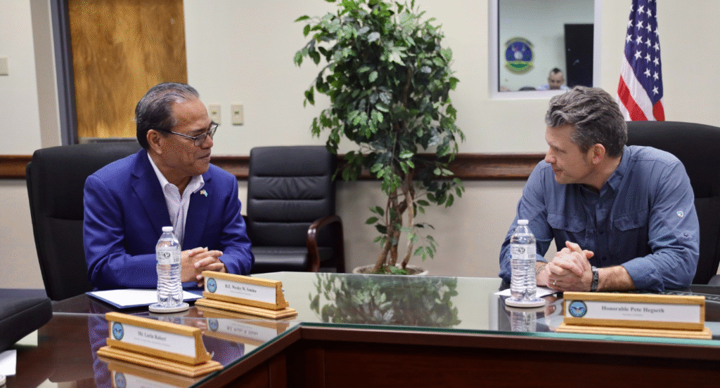 FSM President Wesley Simina and U.S. Defense Secretary Pete Hegseth discussed the Pentagon’s plan to invest $2 billion in the Pacific nation in March 2025.