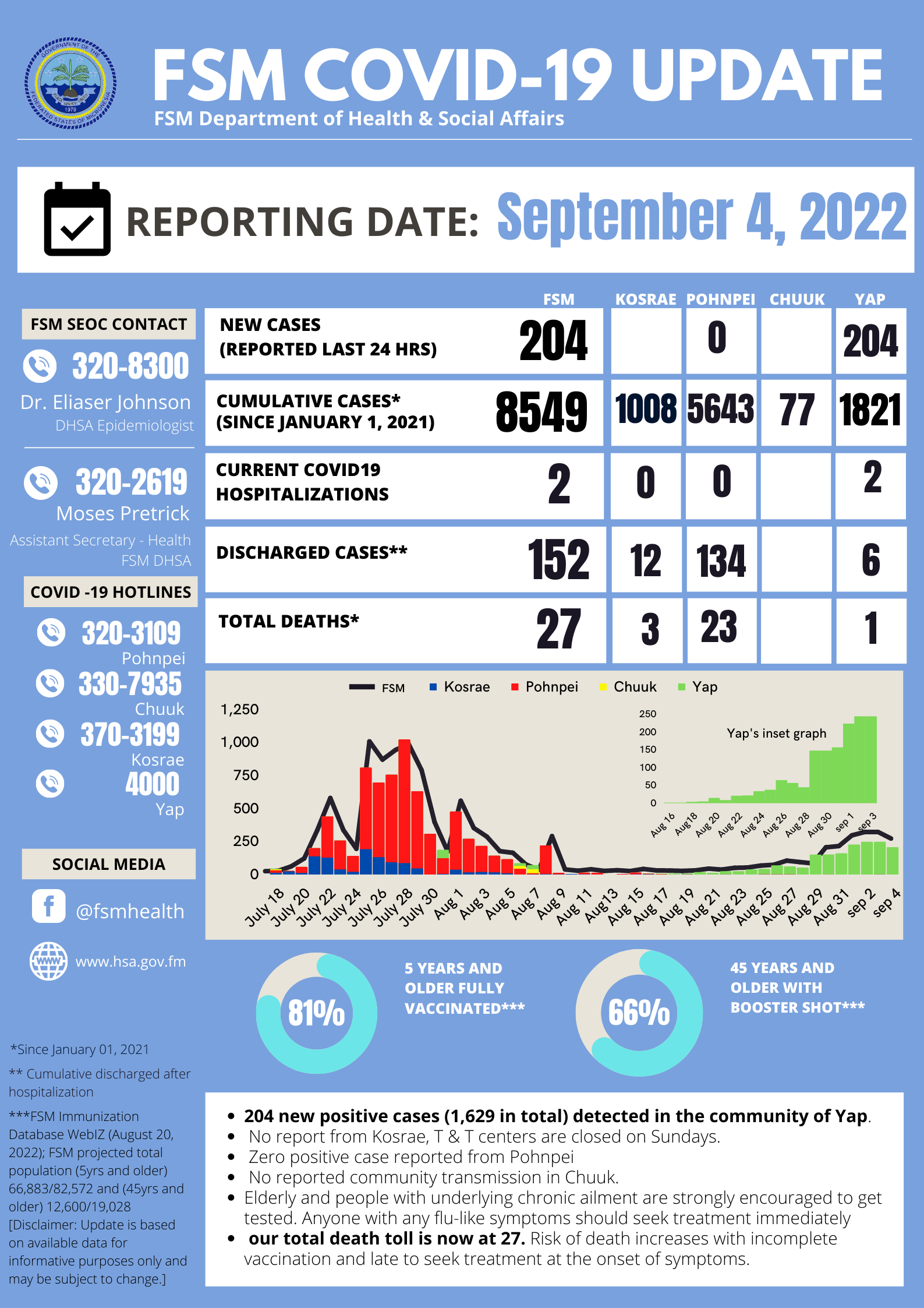 HAGÅTÑA (The Guam Daily Post) — The Federated States of Micronesia Department of Health and Social Affairs reported on Sunday 204 new Covid-19 cases in the state of Yap.