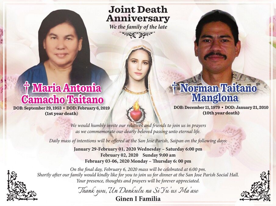 Maria Antonia Camacho Taitano & Norman Taitano Manglona joint death anniversary