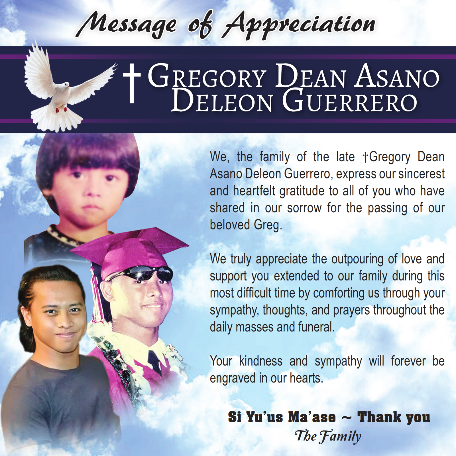 Message of Appreciation – †Gregory Dean Asano Deleon Guerrero