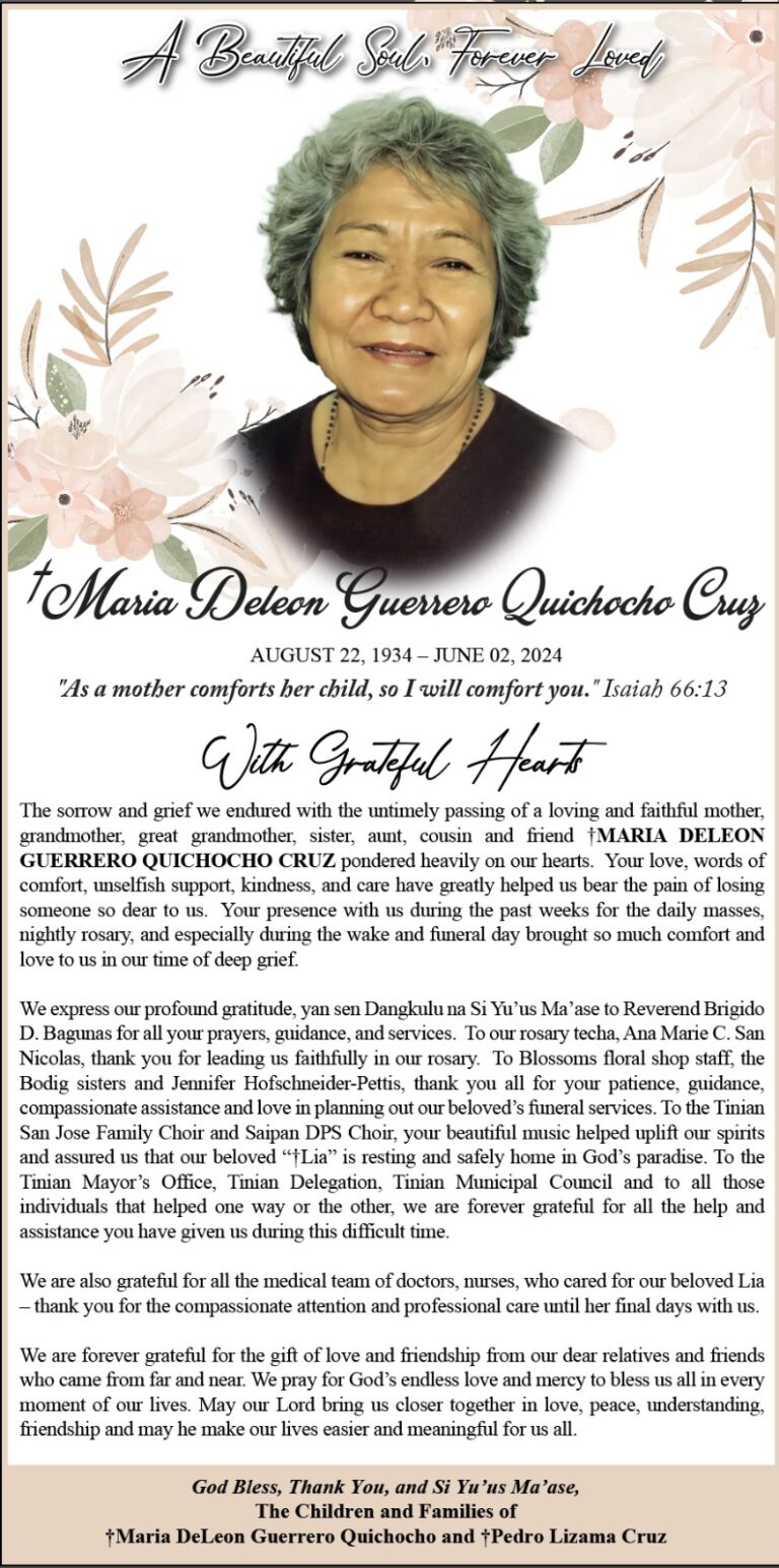 Message of Appreciation: †Maria Deleon Guerrero Quichocho Cruz