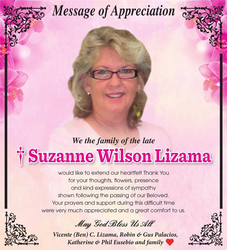 Maria Amparo Tudela Palacios Crisostomo family message of appreciation