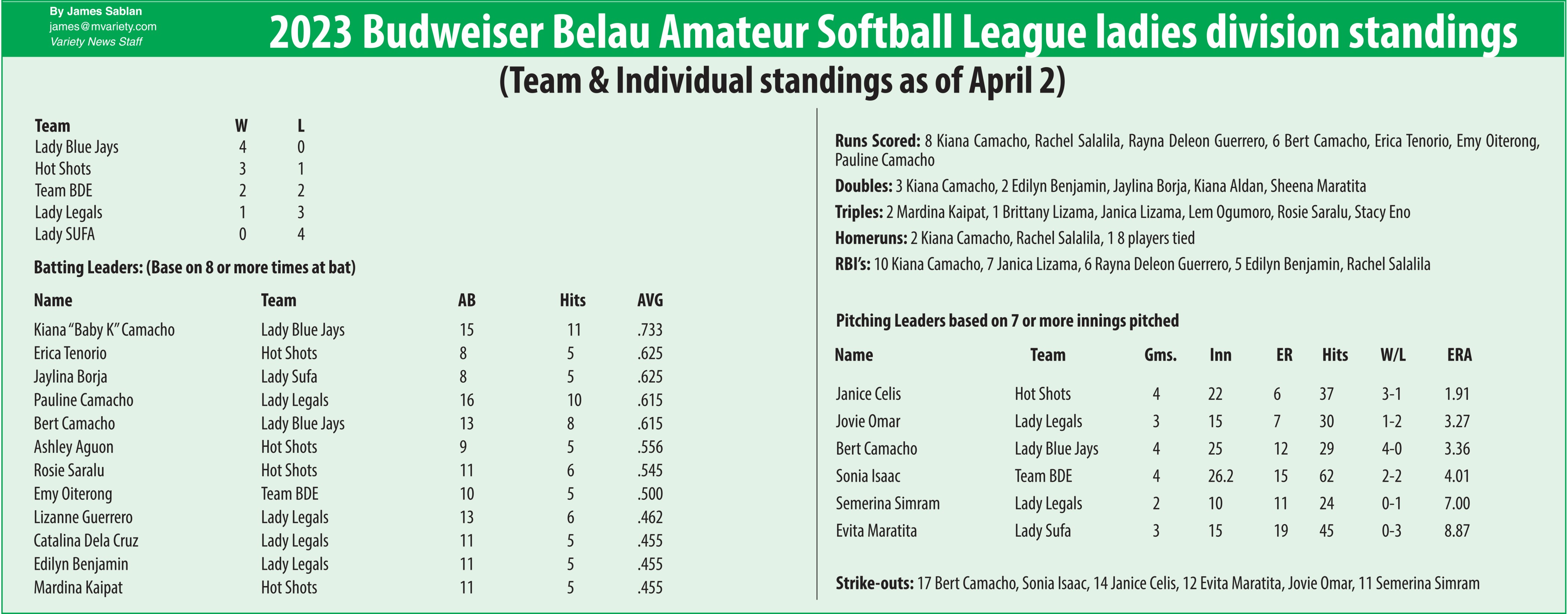 2023 Budweiser Belau Amateur Softball League ladies division standings