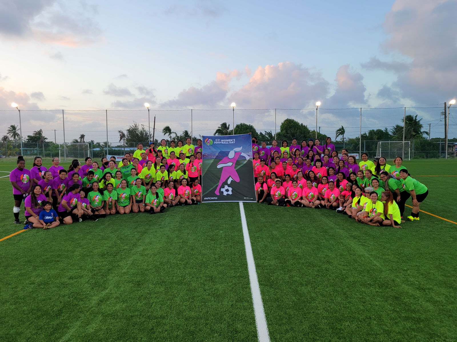 The teams participating in the 2022 Spring Dove Women’s Premier, Intermediate  and Novice Leagues  pose for a photo at the conclusion of the Asian Football Confederation Football Day celebration Sunday at the NMI Soccer Training Center in Koblerville.