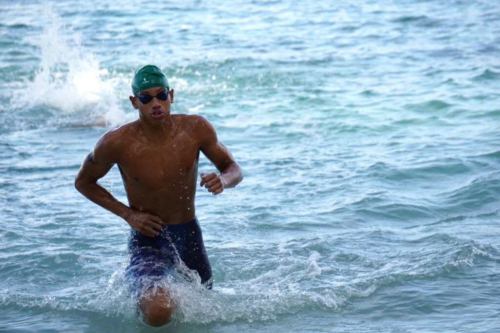 Isaiah Aleksenko rushes to the finish line in the male 1500m race of the Tan Holdings 50th Anniversary Ocean Swim on Saturday at Guma Sakman.