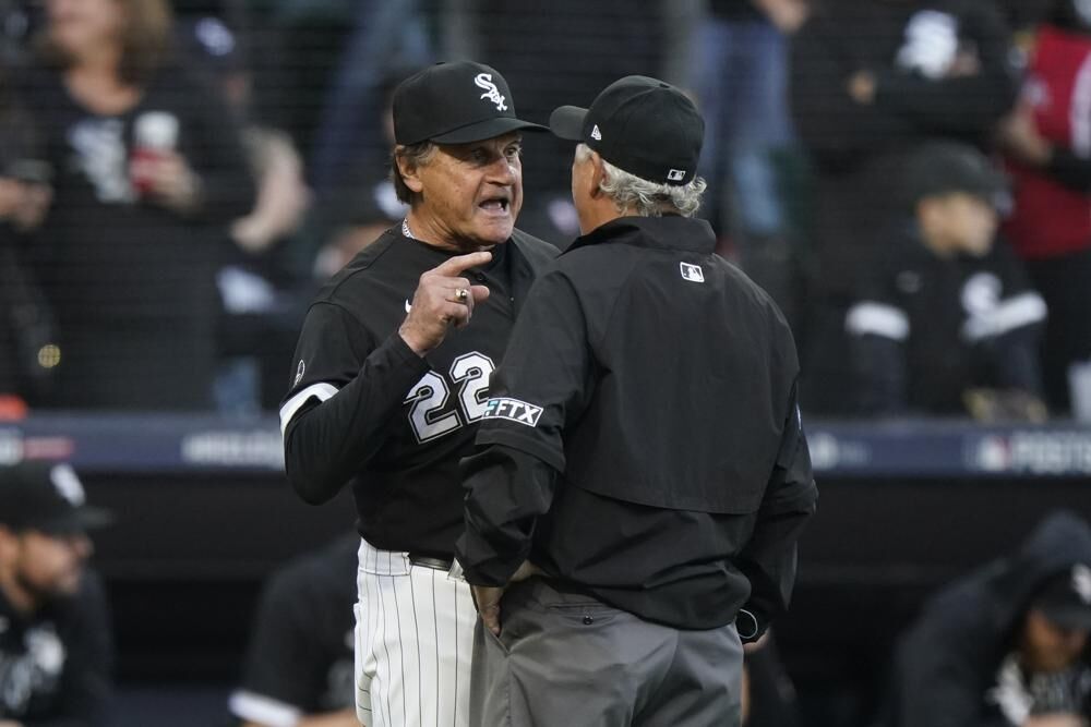 Chicago White Sox manager Tony La Russa argues with umpire Tom Hallion after Jose Abreu was hit by a pitch against the Houston Astros in the eighth inning during Game 4 of a baseball American League Division Series, Tuesday, in Chicago.