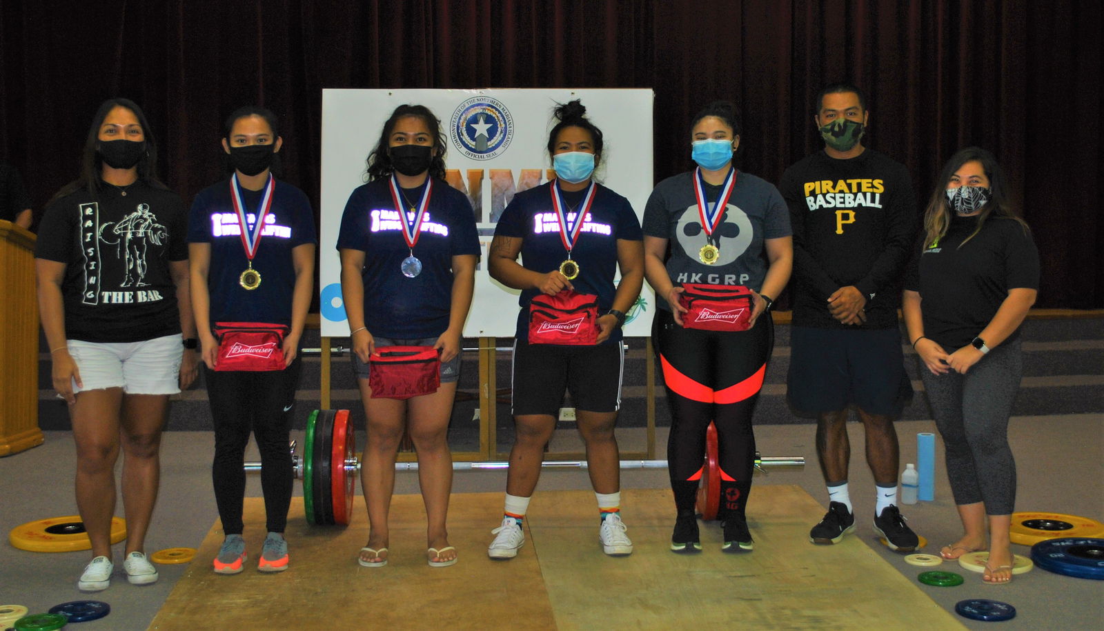 Medalists Zarinea Sapong, Riella Ichiuo, Antonette Labausa and Danica Guevarra pose with CNMI Weightlifting officials during the awards ceremony of the 2nd Marianas Cup on Saturday at the multi-purpose center.