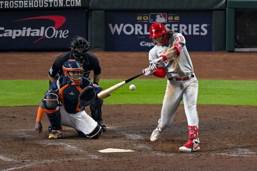Philadelphia Phillies third baseman Alec Bohm (28) hits a double against the Houston Astros during the ninth inning during game two of the 2022 World Series at Minute Maid Park in Houston, Texas, Oct. 29, 2022.