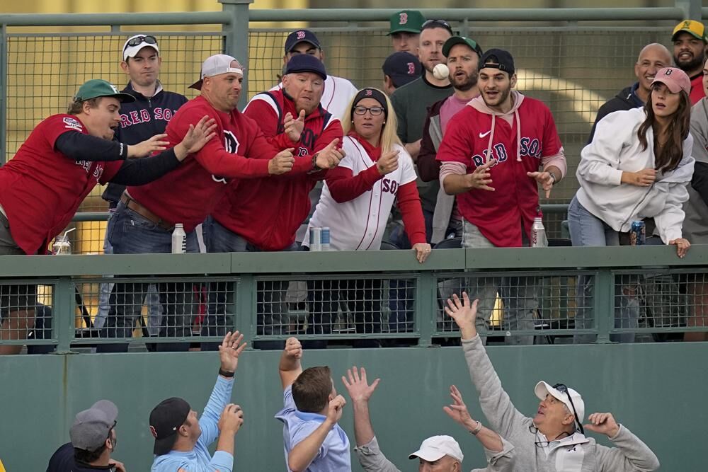 Fans try to catch a home ball by Houston Astros’ Yordan Alvarez during the second inning in Game 5 of baseball’s American League Championship Series against the Boston Red Sox Wednesday in Boston.