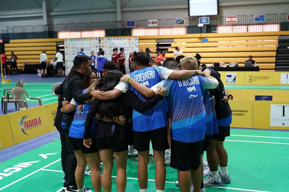 The NMI badminton team members huddle before the start of the individual events at the Ada gym on Thursday.