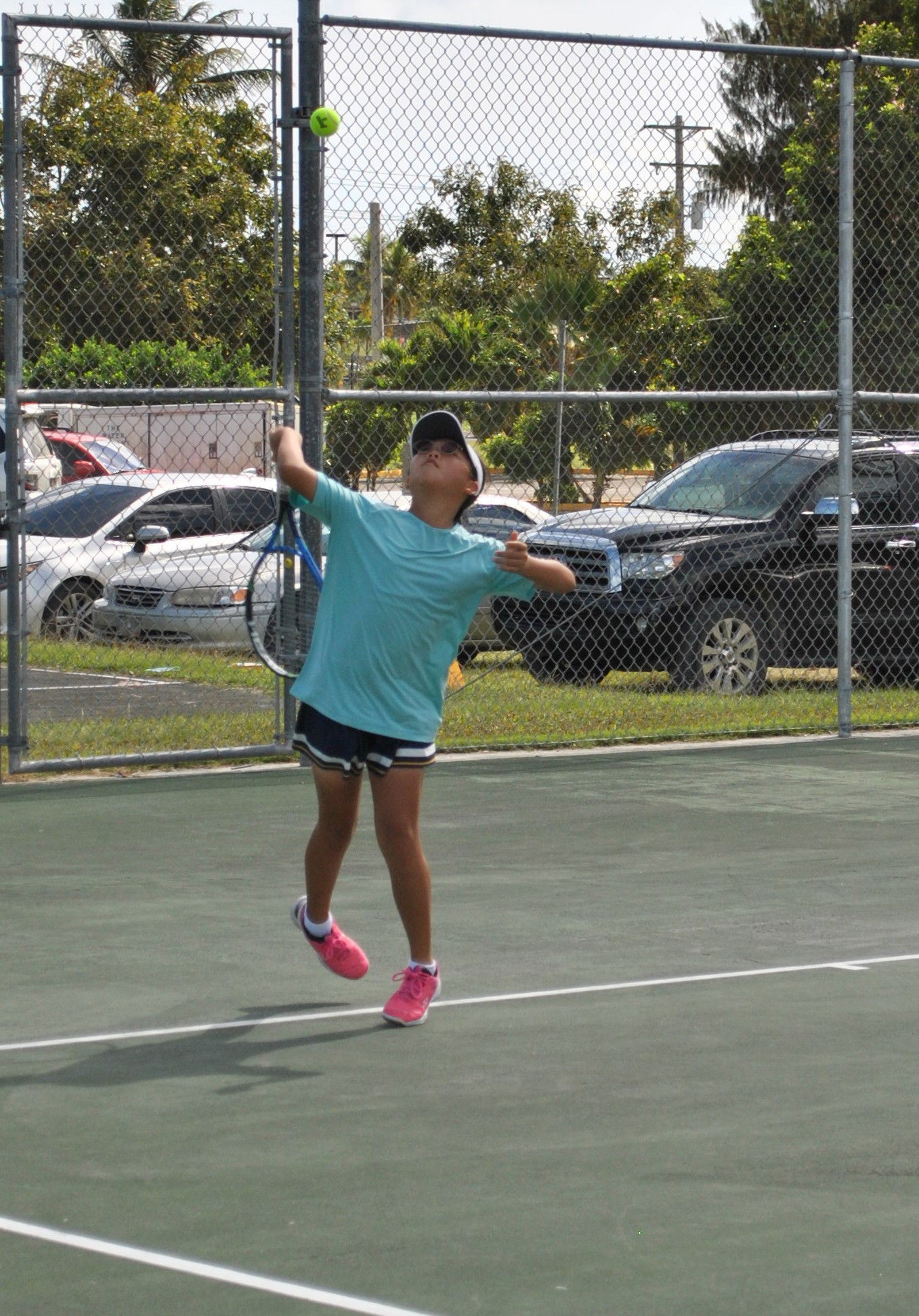 Hannah Chae makes the overhead serve during a tennis match at the American Memorial Park tennis court.