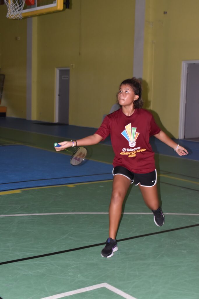 Kaya Braxton attempts the forehand return during Monday’s championship game of the TakeCare Badminton Open Junior Division at the Ada gym.