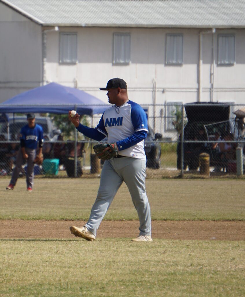 The Brewers’ Franco Nakamura looks at the ball after securing an out in a Tan Holdings Saipan Baseball League game at the Francisco “Tan Ko” Palacios Baseball Field.