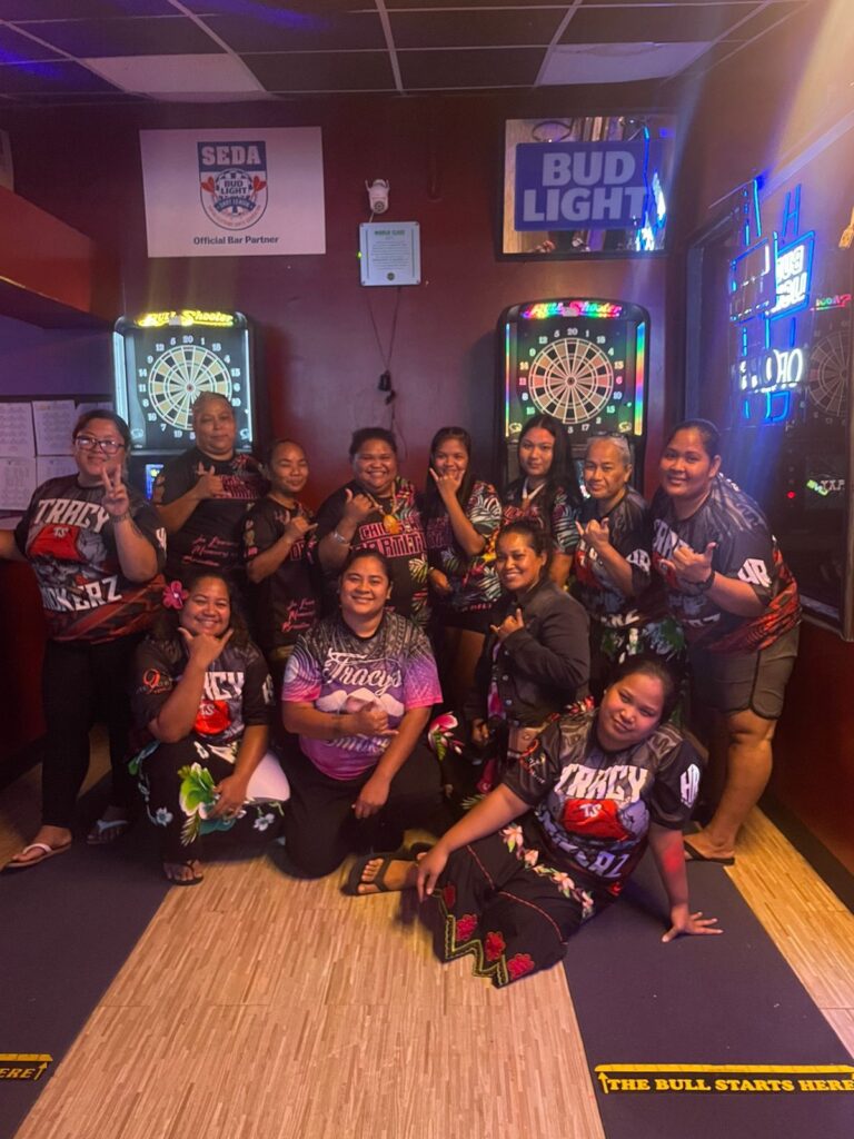 The Flamingo Chicks w/ Dartitudes and the 9 Eleven Tracy’s Smokers pose for a photo during their game in the ladies division of the 2023 SEDA Bud Light Dart League on Monday at 9 Eleven Restobar.