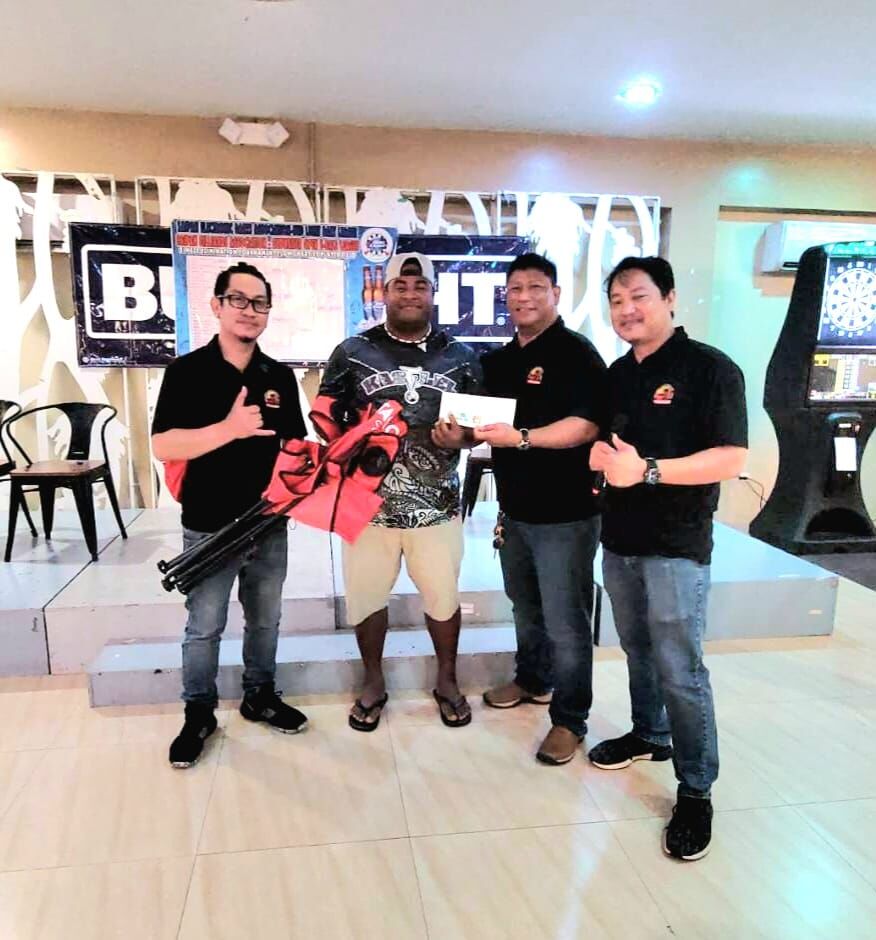 James Welly, 2nd left, poses with Saipan Electronic Darts Association officers after winning the 2023 SEDA Captains Meeting tourney at the Rendezvous Restaurant of Saipan Vegas.