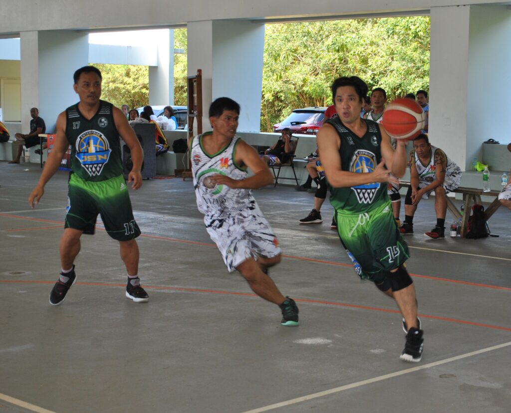 JSN’s Melvin Villarin drives past a defender during a masters division game of the Legends Sports Association Invitational Basketball League Sunday at the Koblerville gym.