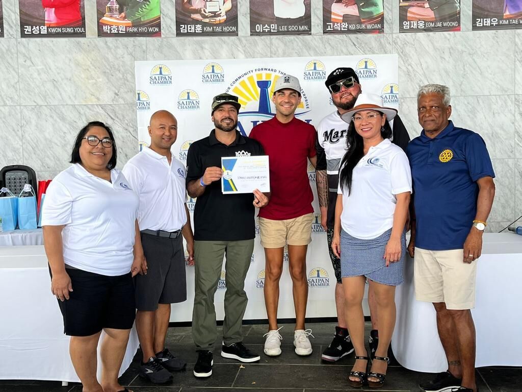 Marianas Variety president Amier C. Younis, 3rd left, and Dominic Kieffer, center, pose for a photo with Saipan Chamber of Commerce treasurer Janice Tenorio, left, president Joseph Guerrero, 2nd left, vice president Shayne Villanueva, 3rd right, secretary Marcia Calvo, 2nd right, and Das Krishnan, right, during the awards ceremony of the chamber’s golf tournament Saturday at LaoLao Bay Golf & Resort.