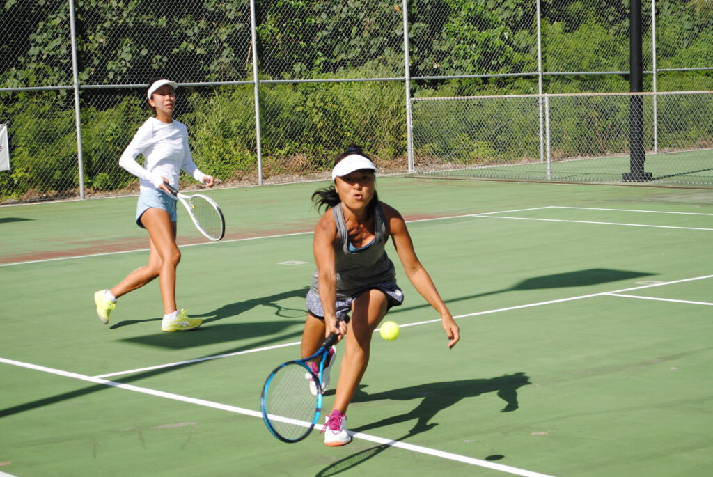 Harumi Suzuki, right, reaches out for the save during the Women’s Double 4 championship match of the 11th Tan Holdings Tennis Classic at the American Memorial Park tennis court on Saturday.