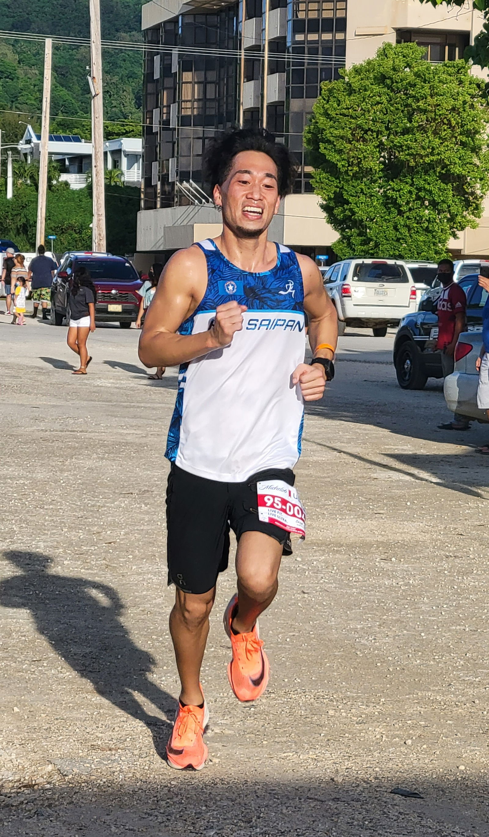 Shuji Kuroda smiles as he approaches the finish line of the Michelob Ultra 4-Mile Run for Taste and Pokka 4-Mile Sunset Run on Saturday at the Garapan Fishing Base.