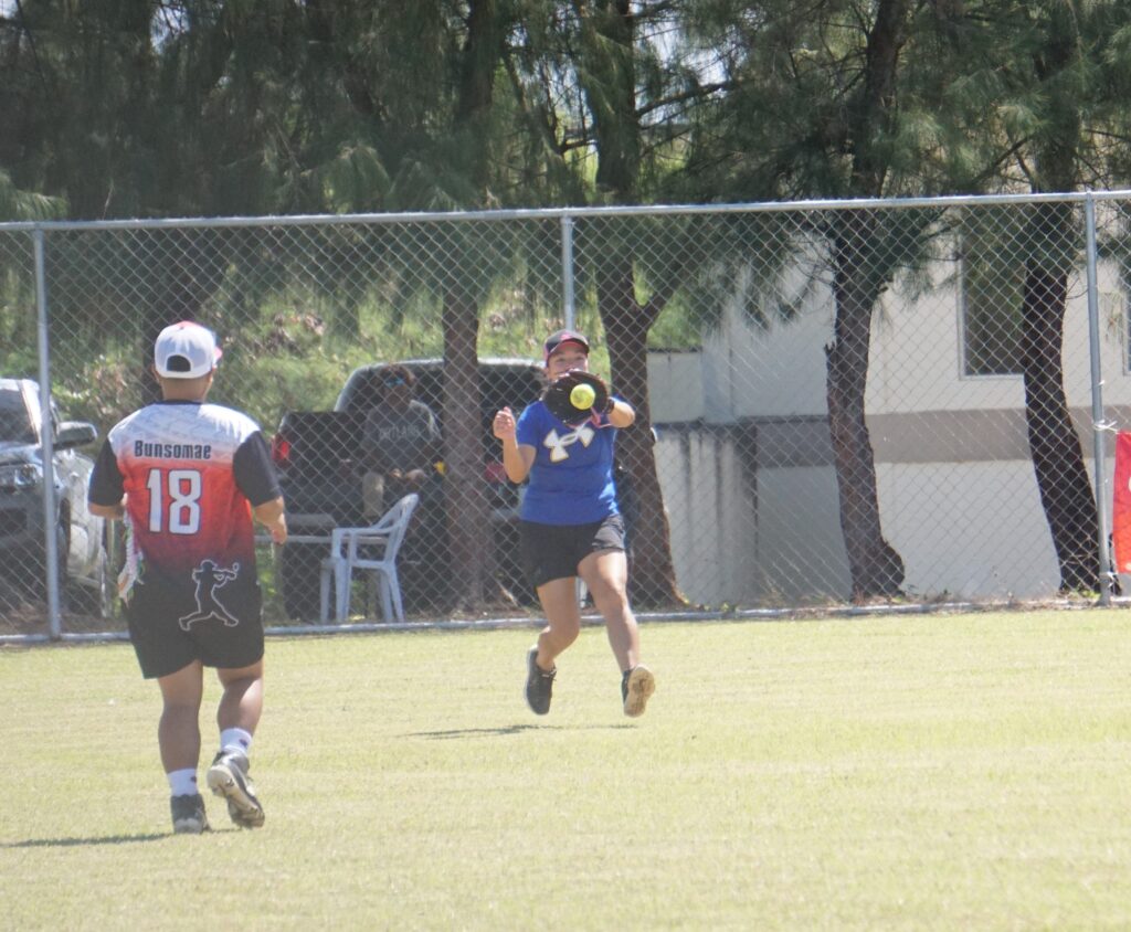Lady Blue Jays centerfielder Rachel Salalila secures the line drive during a ladies division game of the 2023 Budweiser Belau Amateur Softball League at the Dandan baseball field on Sunday.