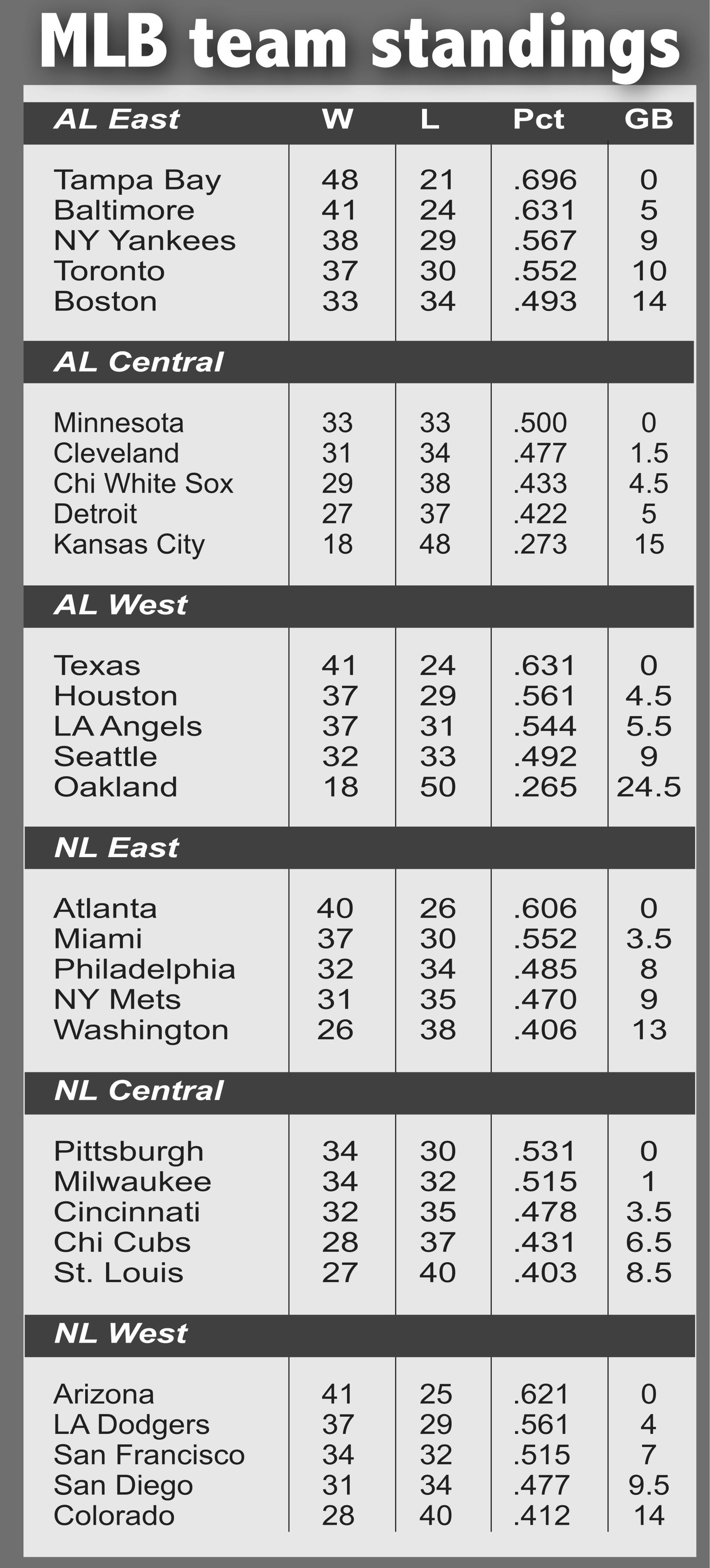 Oakland (18-50) loaded the bases with none out in the fifth against Zach Eflin (8-2) with two straight walks and Jace Peterson’s single. One out later, Langeliers delivered.
