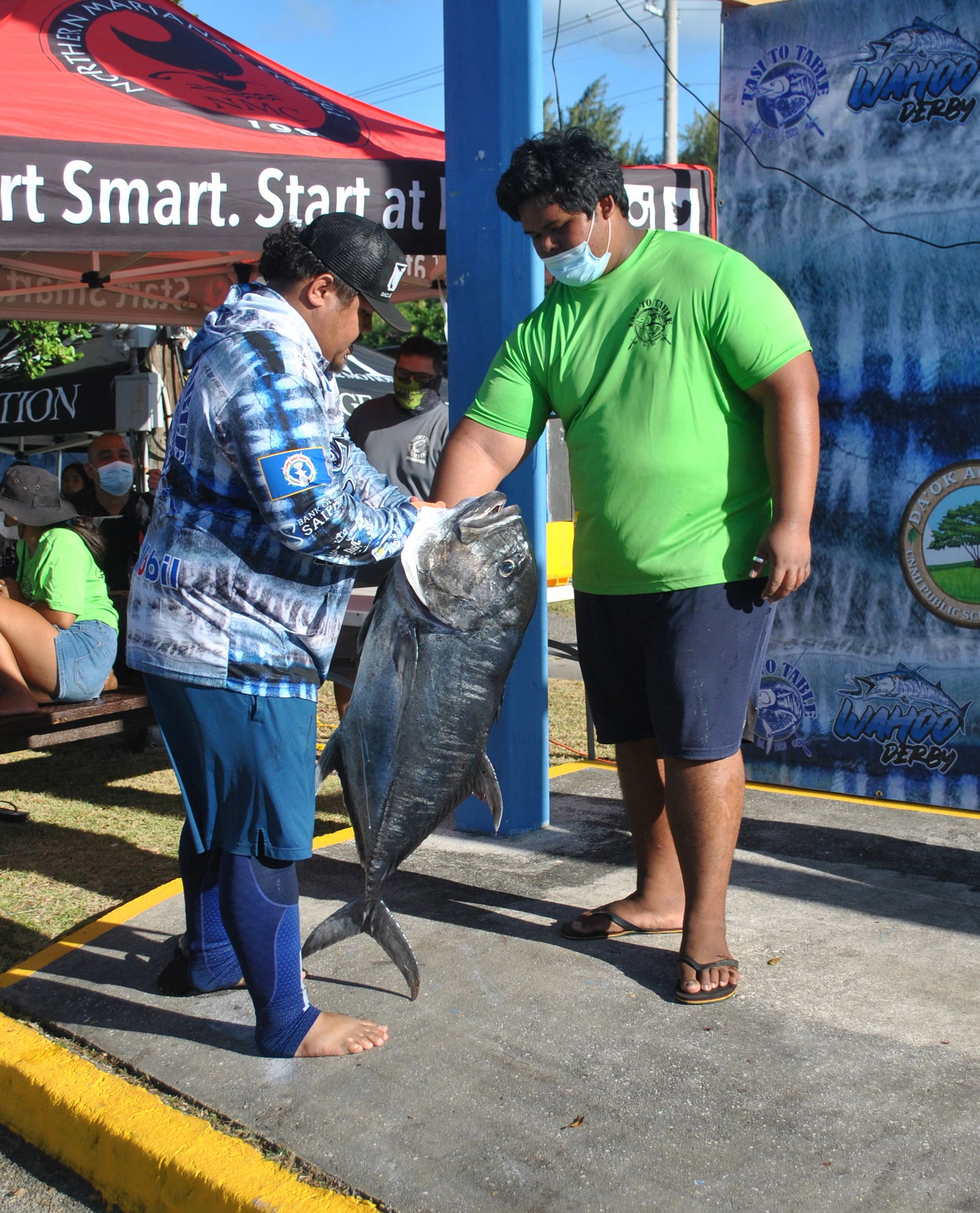 A fisherman, left, hands an amberjack to an event organizer during the Wahoo in the Marianas tournament held on March 6, 2021 at the Smiling Cove Marina.