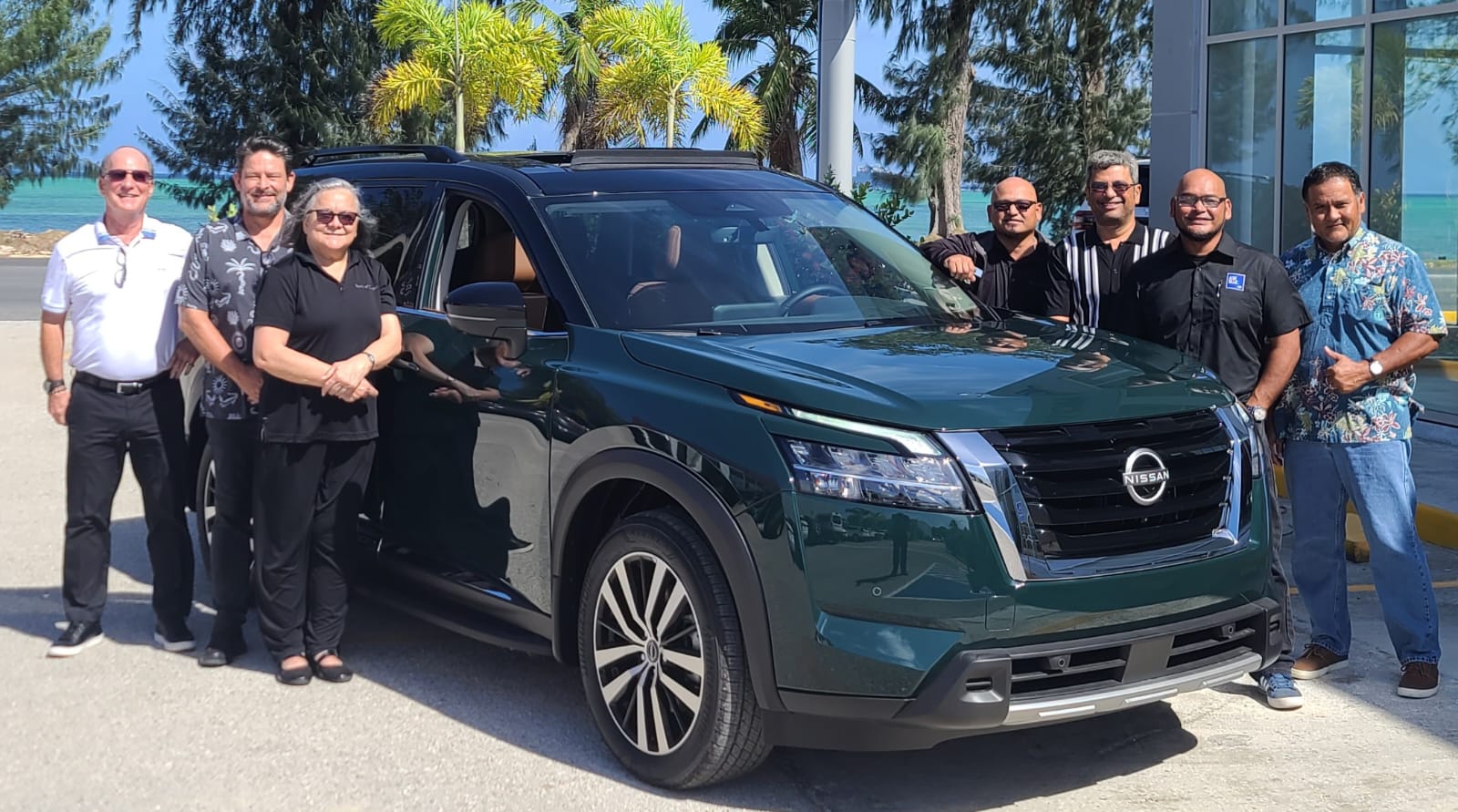 Joeten Moters donates 2024 Nissan Pathfinder Platinum Edition as a Hole-in-One Prize for the 2024 Visa Marianas Class Golf Tournament happening this Saturday, May 26 at the Laolao Bay Golf & Resort. In the photo, from left, Hands Mickelson, sponsorship coordinator; Matt Deets, VP Joeten Motors; Marcie Tomokane, Bank of Guam VP, CNMI regional manager; Gus Palacios, Bank of Guam utility manager; Ray Alvarez, Joeten sales manager; Paul Guerrero, IT&E sales manager; Jack Salan, IP&E operations manager.