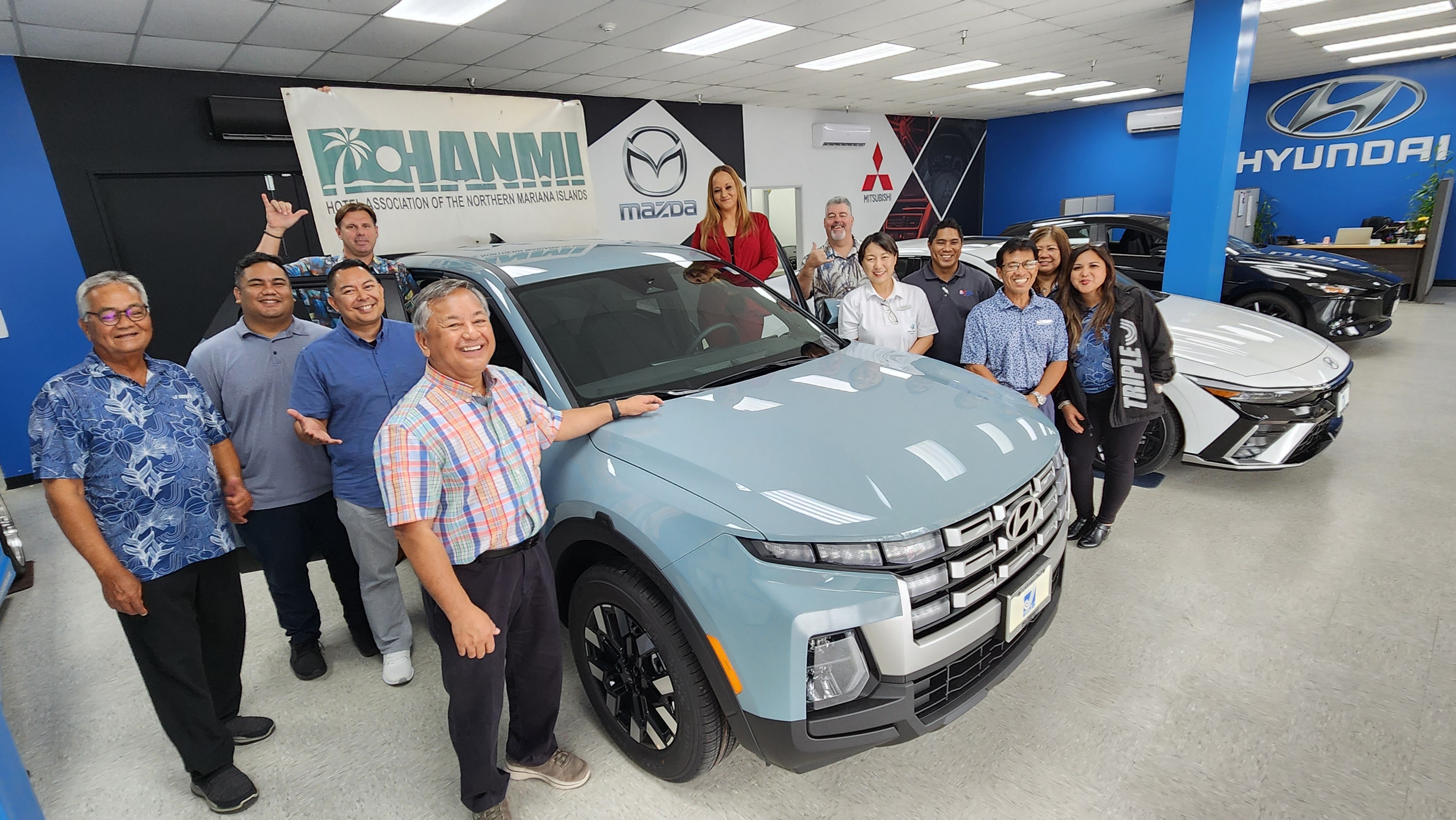 A 2025 Hyundai Santa Cruz SE is presented on July 3, 2025, by Triple J Motors General Manager Sean Ficke at the company showroom in Chalan Laulau, Saipan as a hole-in-one prize for the 23rd Annual HANMI Charity Classic Golf Tournament.  The tournament is scheduled for July 26 at LaoLao Bay Golf & Resort.  From left, Triple J Motors Sales Associate Ben Lizama; Triple J Attorney Jose Mafnas and Business Development Manager Fred Camacho; Ficke; Triple J Senior Vice President Mike Sablan; Deanna Reyes; Triple J Construction Manager Mario Valentino; golf committee member Noriko Watanabe, committee chairman William Retardo, and committee member Archie Ajoste; and Triple J Motors Sales Associate Jamie Barcinas.