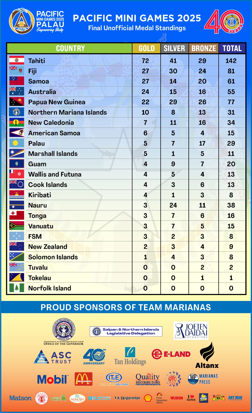 With the NMI collecting a couple more medals in the final days of competition, it ranked 6th among the 23 countries that participated in the Mini Games. Tahiti topped the overall medal tally with a 72-41-29 record, followed by Fiji (27-30-24), Samoa (27-14-20), Australia (24-15-16), and Papua New Guinea (22-29-26).