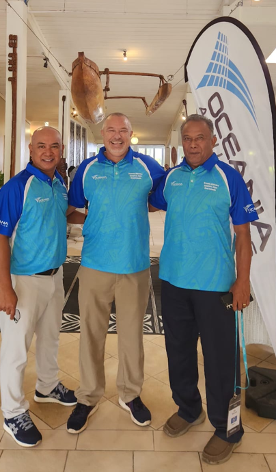 From left, Oceania Athletics President Robin Sapong, Oceania Athletics Association Masters Commission member Greg Borja, and Northern Marianas Athletics President Tebuteb pose for a photo during their visit to Rarotonga, Cook Islands, where they attended the OAA Congress and worked with member federations to ensure alignment with both the World Athletics and Oceania Athletics strategic plans.