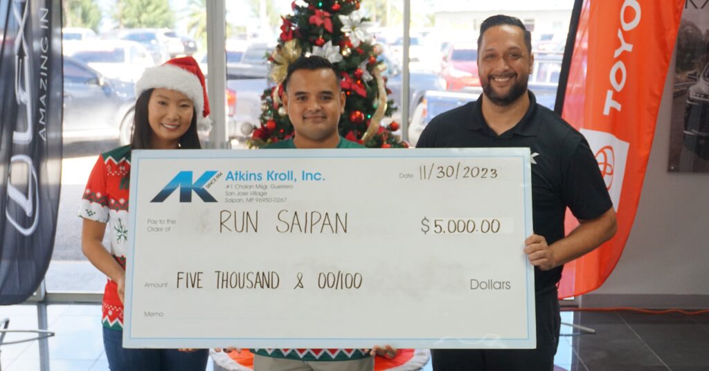 Run Saipan Vice President Jenna Kong, left, and President Edward Dela Cruz Jr., center, receive a ceremonial check for $5,000 from Atkins Kroll Sales Manager Kevin Barnes, right, in the Atkins Kroll showroom on Thursday. AK is the title sponsor of the 2nd Annual 2023 Run Saipan Holiday Half Marathon and AK 5K Fun Run set for Saturday, Dec. 9.