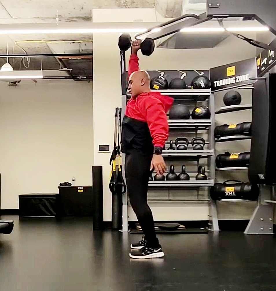 Next on his list is the squat movement, which challenges an individual’s glutes, legs (calves, quads, hamstring), and core.