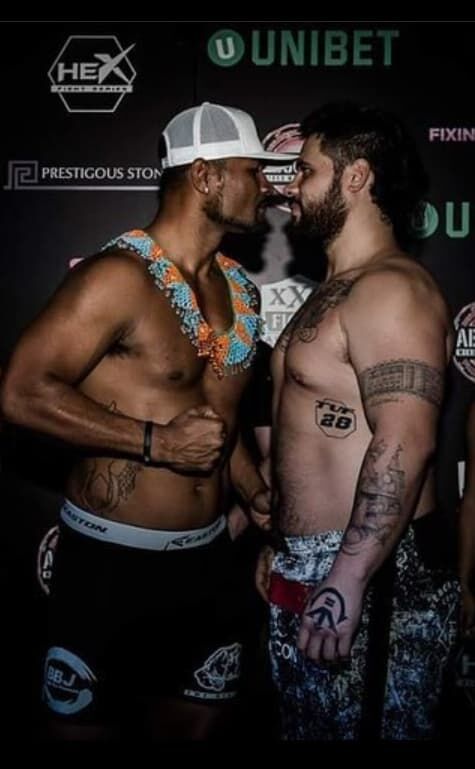 Kelvin Fitial faces Ben Sosoli during the weigh-in for Hex Fight Series 18 in Melbourne, Australia in March 2019.