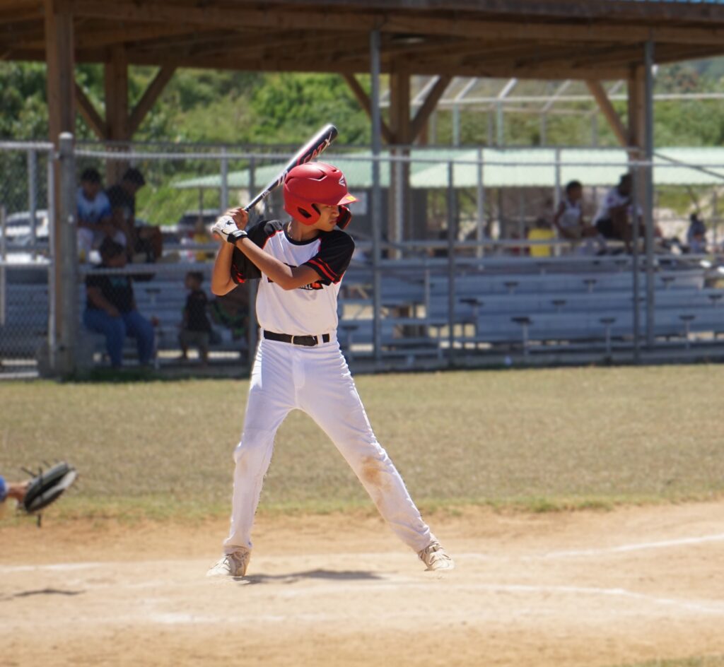 Bears Jr.’s Daniel Camacho readies for the incoming pitch during a junior division game of the 2025 Saipan Little League Baseball at the Francisco “Tan Ko” Palacios Baseball Field.