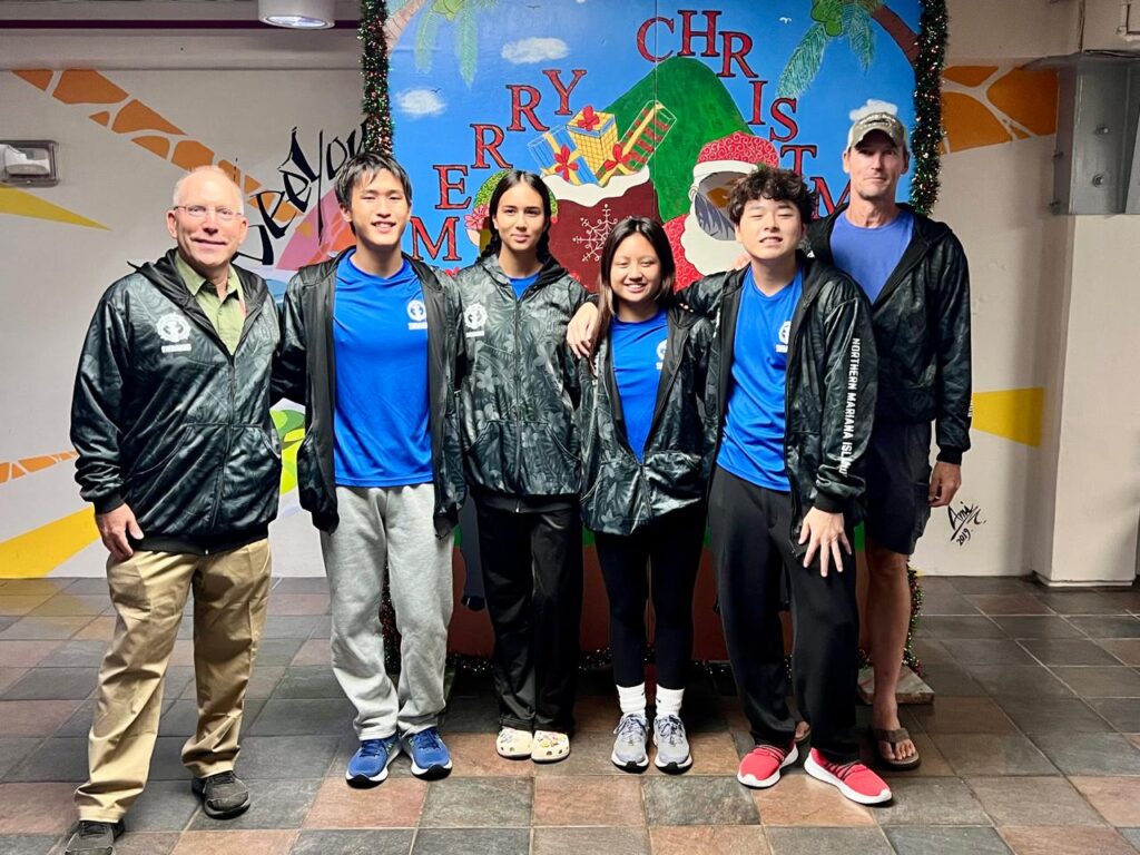 NMI Swimming Federation official John Hirsch with swimmers Kouki Watanabe, Frances Raho, Maria Batallones and Taiyo Akimaru along with Saipan Swim Club head coach Richard Sikel pose for a photo before heading to Budapest, Hungary where the local swimmers will compete in the 2024 World Aquatics Short Course Swimming Championships.