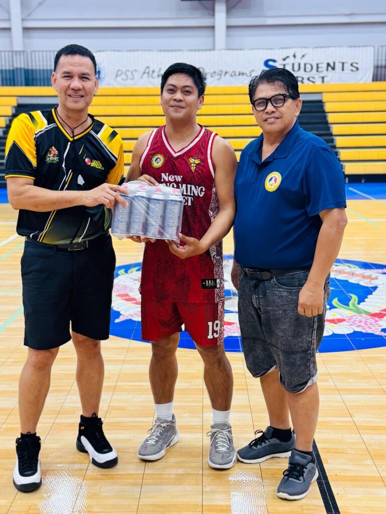Chang Ming’s Rodel Pastrana, center, receives a pack of butane canisters as Best Player of the Game from United Filipino Organization Vice President Jose Espino, right, and League Commissioner Bernie Abuen at the Gilbert C. Ada Gym on Wednesday.