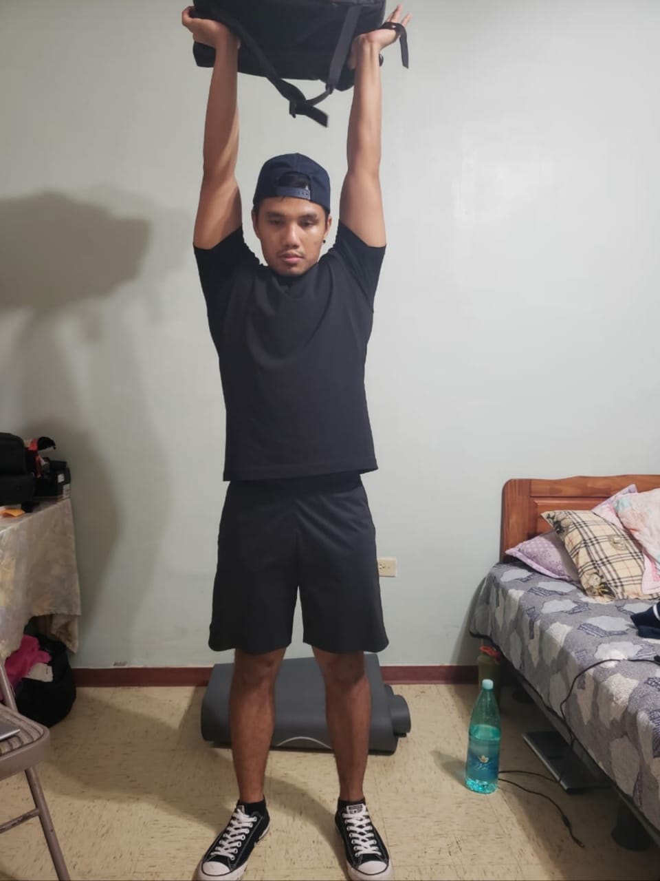 Enrico Valdez lifts a weighted backpack during one of his online sessions. Contributed photo